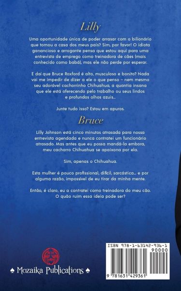 Lilly Uma oportunidade única de poder arrasar com o bilionário que tomou a casa dos meus pais? Sim, por favor! O idiota ganancioso e arrogante pensa que estou aqui para uma entrevista de emprego como treinadora de cães (mais conhecido como babá), mas ele não perde por esperar. E daí que Bruce Roxford é alto, musculoso e bonito? Nada vai me impedir de dizer a ele o que penso - nem mesmo seu adorável cachorrinho Chihuahua, a quantia insana que ele está oferecendo pelo trabalho ou seus lindos e profundos olhos azuis... Junte tudo isso? Estou em apuros. Bruce Lilly Johnson está cinco minutos atrasada para nossa entrevista agendada e nunca contratei um funcionário atrasado. Mas antes que eu possa mandá-la embora, meu cachorro Chihuahua se apaixona por ela. Sim, apenas o Chihuahua. Esta mulher é pouco profissional, difícil, sarcástica... e por alguma razão, impossível de eu tirar da minha mente. Então, é claro, eu a contratei como treinadora do meu cão. O quão ruim essa ideia pode ser?