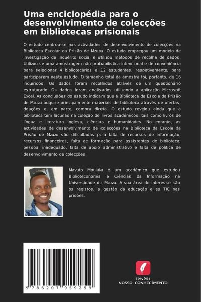 O estudo centrou-se nas actividades de desenvolvimento de colecções na Biblioteca Escolar da Prisão de Mzuzu. O estudo empregou um modelo de investigação de inquérito social e utilizou métodos de recolha de dados. Utilizou-se uma amostragem não probabilística intencional e de conveniência para selecionar 4 bibliotecários e 12 estudantes, respetivamente, para participarem neste estudo. O tamanho total da amostra foi, portanto, de 16 inquiridos. Os dados foram recolhidos através de um questionário estruturado. Os dados foram analisados utilizando a aplicação Microsoft Excel. As conclusões do estudo indicam que a Biblioteca da Escola da Prisão de Mzuzu adquire principalmente materiais de biblioteca através de ofertas, doações e, em parte, compra direta. O estudo revelou ainda que a biblioteca tem lacunas na coleção de livros académicos, tais como livros de língua e literatura inglesa, ciências e humanidades. No entanto, as actividades de desenvolvimento de colecções na Biblioteca da Escola da Prisão de Mzuzu são dificultadas pela falta de recursos de informação, recursos financeiros, falta de formação para assistentes de biblioteca, pessoal inadequado, falta de apoio administrativo e falta de política de desenvolvimento de colecções.