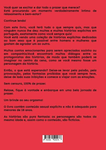 Você quer se excitar e dar todo o prazer que merece?Está procurando um momento verdadeiramente íntimo de relaxamento e bem-estar?Então continue lendo!Com este livro, você terá tudo o que sempre quis e que ninguém nunca lhe deu: muitas e muitas histórias explícitas em português, exatamente como você sempre quis!Você tem diante de si uma coleção de histórias explícitas dedicadas ao bom sexo que é possível entre homens e mulheres que gostam de agradar um ao outro. Muitos contos excitantes para experimentar sozinho ou acompanhado.Você encontrará muitos diálogos entre os protagonistas das histórias, de modo que também poderá se imaginar no centro da cena, como se você mesmo fosse um personagem da história.Então, o que está esperando? Deixe-se levar pela paixão, pela provocação, pelas fantasias proibidas que você sempre teve, deixe de lado suas inibições e comece a viajar com as emoções.Sem censura, 100% de prazer.Relaxe, fique à vontade e embarque em uma bela jornada de prazer.Um brinde ao seu orgasmo!