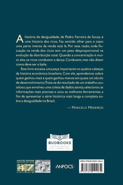 A história da desigualdade de Pedro Ferreira de Souza é uma história dos ricos. Faz sentido olhar para o topo: uma parte imensa da renda está lá. Por essa razão, toda flutuação na renda dos ricos tem um peso desproporcional na evolução da distribuição total. Quando a concentração é muito alta, os ricos conduzem a dança. Conduzem, mas não ditam como deve ser o baile. Este livro encaixa uma peça importante no quebra-cabeças da história econômica brasileira. Com ele, aprendemos sobre quem ganhou mais e quem ganhou menos em quase um século de desenvolvimento. Trata-se do resultado de um trabalho cauteloso, que envolveu uma coleta de dados atenta, selecionou as informações mais precisas e usou as melhores ferramentas, a fim de apresentar a série histórica mais longa e completa sobre a desigualdade no Brasil. ¿ Marcelo Medeiros
