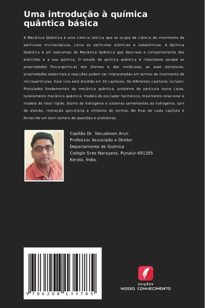 A Mecânica Quântica é uma ciência teórica que se ocupa da ciência do movimento de partículas microscópicas, como as partículas atómicas e subatómicas. A Química Quântica é um subcampo da Mecânica Quântica que descreve o comportamento dos electrões e a sua química. O estudo da química quântica é importante porque as propriedades físico-químicas dos átomos e das moléculas, as suas estruturas, propriedades espectrais e reacções podem ser interpretadas em termos do movimento de micropartículas. Este livro está dividido em 10 capítulos. Os diferentes capítulos incluem: Postulados fundamentais da mecânica quântica, problema da partícula numa caixa, tunelamento mecânico quântico, modelo do oscilador harmónico, movimento rotacional e modelo do rotor rígido, átomo de hidrogénio e sistemas semelhantes ao hidrogénio, spin do eletrão, interação spin-órbita e símbolos de termos. No final de cada capítulo é fornecido um bom número de questões e problemas.