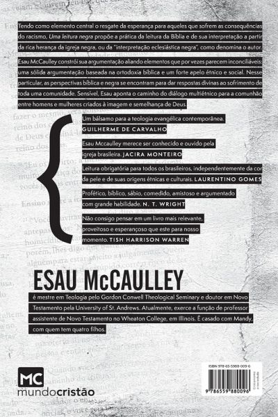 Tendo como elemento central o resgate da esperança para aqueles que sofrem as consequências do racismo, Uma leitura negra propõe a prática da leitura da Bíblia e de sua interpretação a partir da rica herança da igreja negra, ou da "interpretação eclesiástica negra", como denomina o autor. Esau McCaulley constrói sua argumentação aliando elementos que por vezes parecem inconciliáveis: uma sólida argumentação baseada na ortodoxia bíblica e um forte apelo étnico e social. Nesse particular, as perspectivas bíblica e negra se encontram para dar respostas divinas ao sofrimento de toda uma comunidade. Sensível, Esau aponta o caminho do diálogo multiétnico para a comunhão entre homens e mulheres criados à imagem e semelhança de Deus. "Um bálsamo para a teologia evangélica contemporânea." - Guilherme de Carvalho "Esau Mccaulley merece ser conhecido e ouvido pela igreja brasileira." - Jacira Monteiro "Leitura obrigatória para todos os brasileiros, independentemente da cor da pele e de suas origens étnicas e culturais." - Laurentino Gomes "Profético, bíblico, sábio, comedido, amistoso e argumentado com grande habilidade." - N. T. Wright "Não consigo pensar em um livro mais relevante, proveitoso e esperançoso que este para nosso momento." - Tish Harrison Warren "Profundamente bíblico ao propor a cruz de Cristo como única resposta possível para o sofrimento e as injustiças que o racismo impõe ao negro." - Tomás Camba "Mais que bem-vindo à nossa realidade brasileira." - Ricardo Wesley M. Borges "Leia-o com a disposição de mudar, e prepare-se para se surpreender." - Ziel J. O. Machado