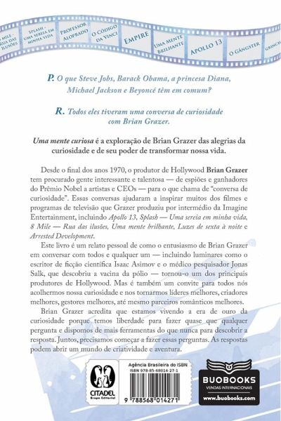 Desde o final dos anos 1970, o produtor de Hollywood Brian Grazer tem procurado gente interessante e talentosa ¿ de espiões e ganhadores do Prêmio Nobel a artistas e CEOs ¿ para o que chama de ¿conversa de curiosidade¿. Essas conversas ajudaram a inspirar muitos dos filmes e programas de televisão que Grazer produziu por intermédio da Imagine Entertainment, incluindo Apollo 13, Splash ¿ Uma sereia em minha vida, 8 Mile ¿ Rua das ilusões, Uma mente brilhante, Luzes de sexta à noite e Arrested Development. Este livro é um relato pessoal de como o entusiasmo de Brian Grazer em conversar com todos e qualquer um ¿ incluindo luminares como o escritor de ficção científica Isaac Asimov e o médico pesquisador Jonas Salk, que descobriu a vacina da pólio ¿ tornou-o um dos principais produtores de Hollywood. Mas é também um convite para todos nós acolhermos nossa curiosidade e nos tornarmos líderes melhores, criadores melhores, gestores melhores, até mesmo parceiros românticos melhores. Brian Grazer acredita que estamos vivendo a era de ouro da curiosidade porque temos liberdade para fazer quase que qualquer pergunta e dispomos de mais ferramentas do que nunca para descobrir a resposta. Juntos, precisamos começar a fazer essas perguntas. As respostas podem abrir um mundo de criatividade e aventura.
