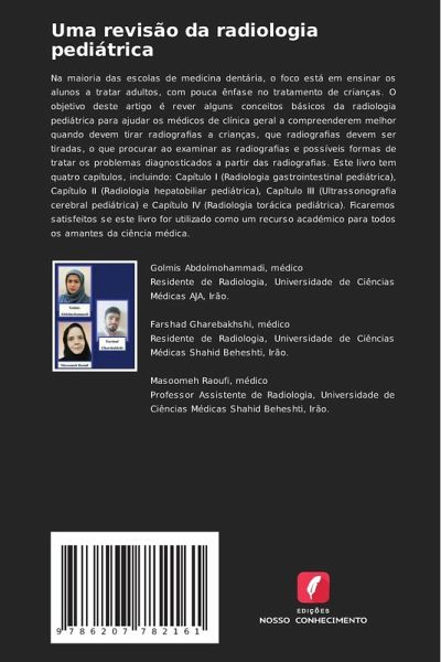 Na maioria das escolas de medicina dentária, o foco está em ensinar os alunos a tratar adultos, com pouca ênfase no tratamento de crianças. O objetivo deste artigo é rever alguns conceitos básicos da radiologia pediátrica para ajudar os médicos de clínica geral a compreenderem melhor quando devem tirar radiografias a crianças, que radiografias devem ser tiradas, o que procurar ao examinar as radiografias e possíveis formas de tratar os problemas diagnosticados a partir das radiografias. Este livro tem quatro capítulos, incluindo: Capítulo I (Radiologia gastrointestinal pediátrica), Capítulo II (Radiologia hepatobiliar pediátrica), Capítulo III (Ultrassonografia cerebral pediátrica) e Capítulo IV (Radiologia torácica pediátrica). Ficaremos satisfeitos se este livro for utilizado como um recurso académico para todos os amantes da ciência médica.