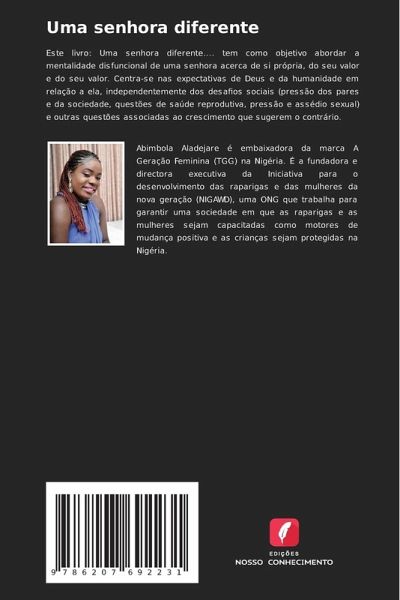 Este livro: Uma senhora diferente.... tem como objetivo abordar a mentalidade disfuncional de uma senhora acerca de si própria, do seu valor e do seu valor. Centra-se nas expectativas de Deus e da humanidade em relação a ela, independentemente dos desafios sociais (pressão dos pares e da sociedade, questões de saúde reprodutiva, pressão e assédio sexual) e outras questões associadas ao crescimento que sugerem o contrário.
