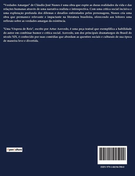 "Verdades Amargas" de Cláudio José Nunes é uma obra que expõe as duras realidades da vida e das relações humanas através de uma narrativa realista e introspectiva. Com uma crítica social incisiva e uma exploração profunda dos dilemas e desafios enfrentados pelos personagens, Nunes cria uma obra que permanece relevante e impactante na literatura brasileira, oferecendo aos leitores uma reflexão sobre as verdades amargas da existência. "Uma Véspera de Reis", escrito por Artur Azevedo, é uma peça teatral que exemplifica a habilidade do autor em combinar humor e crítica social. Azevedo, um dos principais dramaturgos do Brasil do século XIX, é conhecido por suas comédias que abordam as questões sociais e culturais de sua época de maneira leve e divertida.