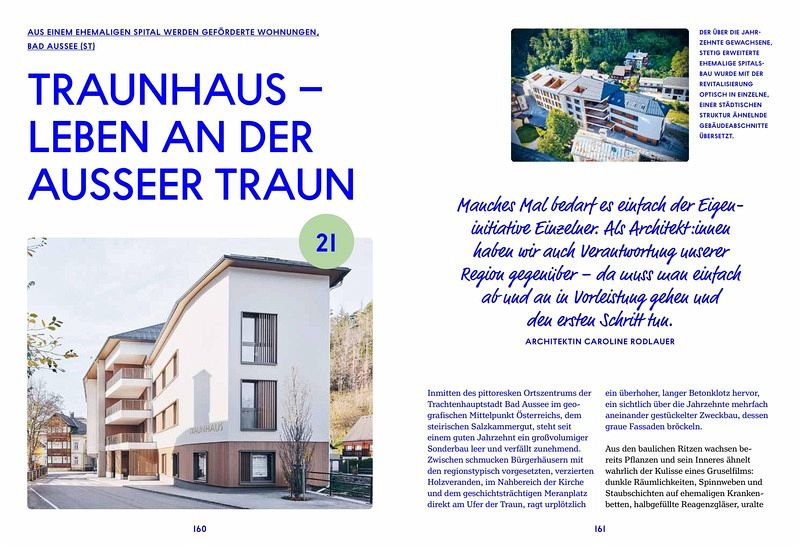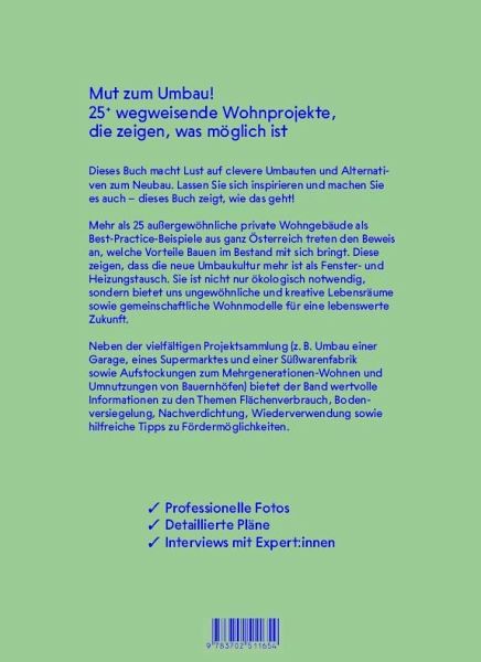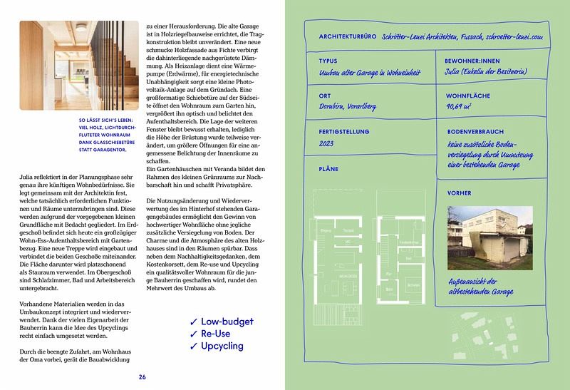 Neben der Projektsammlung bietet das Buch auch wertvolle Informationen zu den Themen Flächenverbrauch, Bodenversiegelung, Ressourcenmanagement, Lebenszyklus Bauwirtschaft, Wohnen der Zukunft, Klimaneutralität, regionale Bauweisen.