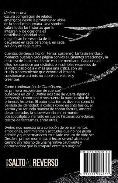 Umbra es una oscura compilación de relatos emergidos desde la profundidad abisal de la conducta humana. Una sombra cubre todas las historias que la integran, y los ocasionales destellos de claridad solo magnifican la presencia de la oscuridad en cada personaje, en cada acción y en cada relato. Cuentos de ciencia ficción, terror, suspenso, fantasía e incluso romance pueblan cada página con las alucinantes creaciones y la destreza de la pluma de este escritor mexicano. Cada uno de ellos nos conduce por distintos e insufribles recovecos de la volátil psicología y, más que una crítica, son un crudo planteamiento que exhorta al lector a cuestionarse a sí mismo sobre sus valores y creencias. Como continuación de Claro Oscuro, su primera recopilación de cuentos publicada en 2017, Umbra nos trae de vuelta algunos personajes conocidos y nos cuenta la parte oculta de sus primeras historias. El autor toca temas diversos como la pérdida de identidad; la codicia como instinto básico, el karma y su rotunda manera de cobrar factura, amores desamparados, la supervivencia en un mundo posapocalíptico, narrado en cuatro historias conectadas, relatos de fantasmas, entre otras. Umbra nos muestra una colección de pensamientos, emociones, sentimientos y actitudes que no nos gusta admitir y que permanecen en el lado oscuro de todo ser. Desde el primer momento, el lector se verá atraído al camino sin retorno de una narrativa cautivante y perturbadora que lo atrapará entre sus páginas.