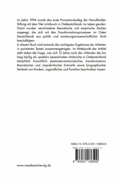 Im Jahre 1994 wurde das erste Promotionskolleg der Hans-Böckler-Stiftung mit dem Titel "Umbruch in Ostdeutschland" ins Leben gerufen. Damit wurden verschiedene theoretische und empirische Studien angeregt, sich mit den Transformationsprozessen im Osten Deutschlands aus politik- und erziehungswissenschaftlicher Sicht zu beschäftigen. In diesem Buch sind erstmals die wichtigsten Ergebnisse der Arbeiten in pointierten Texten zusammen getragen. Im Mittelpunkt der Artikel steht dabei die Frage, wie sich 11 Jahre nach der "Wende" die bislang häufig als "prekär" bezeichneten Umbrüche in Ostdeutschland tatsächlich hinsichtlich staatsinterventionistischer, transformationstheoretischer und utopiekritischer Entwürfe sowie biografischer Verläufe von Kindern, Jugendlichen und Familien beschreiben lassen.