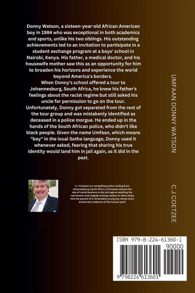 Donny Watson, a sixteen-year-old African American boy in 1984 who was exceptional in both academics and sports, unlike his two siblings. His outstanding achievements led to an invitation to partisipate in a student exchange program at a boys' school in Nairobi, Kenya. His father, a medical doctor, and his housewife mother saw this as an opportunity for him to broaden his horizons and experience the world beyond America's borders. His mother's brother was the United States Ambassador in Kenya, which provided some comfort to his parents, knowing that a family member would be nearby if Donny needed anything. When Donny's school offered a tour to Johannesburg, South Africa, he knew his father's feelings about the racist regime but still asked his uncle for permission to go on the tour. Unfortunately, Donny got separated from the rest of the tour group and was mistakenly identified as deceased in a police morgue. He ended up in the hands of the South African police, who didn't like black people. Given the name Umfaan, which means "boy" in the local Sotho language, Donny used it whenever asked, fearing that sharing his true identity would land him in jail again, as it did in the past. After falling in love across the color line with a white, blonde girl, Donny's life took another unexpected turn, leading him to run away and end up in Swaziland. There, he found work as a gardener with an Indian family only to be wrongly associated with his employer's international crime ring, resulting in his arrest by Interpol and solitary confinement. With its enthralling plot twists and heartfelt moments, this book promises to engage readers from beginning to end.