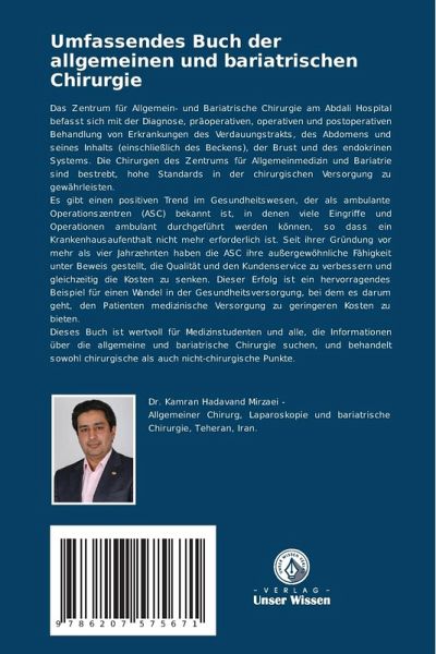Das Zentrum für Allgemein- und Bariatrische Chirurgie am Abdali Hospital befasst sich mit der Diagnose, präoperativen, operativen und postoperativen Behandlung von Erkrankungen des Verdauungstrakts, des Abdomens und seines Inhalts (einschließlich des Beckens), der Brust und des endokrinen Systems. Die Chirurgen des Zentrums für Allgemeinmedizin und Bariatrie sind bestrebt, hohe Standards in der chirurgischen Versorgung zu gewährleisten.Es gibt einen positiven Trend im Gesundheitswesen, der als ambulante Operationszentren (ASC) bekannt ist, in denen viele Eingriffe und Operationen ambulant durchgeführt werden können, so dass ein Krankenhausaufenthalt nicht mehr erforderlich ist. Seit ihrer Gründung vor mehr als vier Jahrzehnten haben die ASC ihre außergewöhnliche Fähigkeit unter Beweis gestellt, die Qualität und den Kundenservice zu verbessern und gleichzeitig die Kosten zu senken. Dieser Erfolg ist ein hervorragendes Beispiel für einen Wandel in der Gesundheitsversorgung, bei dem es darum geht, den Patienten medizinische Versorgung zu geringeren Kosten zu bieten.Dieses Buch ist wertvoll für Medizinstudenten und alle, die Informationen über die allgemeine und bariatrische Chirurgie suchen, und behandelt sowohl chirurgische als auch nicht-chirurgische Punkte.