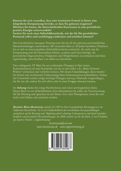 Das Autogene Training wurde in dieser Arbeit der Struktur einer Ganzheitlichen Wahrnehmung angepasst. Als anerkannte und populäre Selbsthilfetechnik kann das AT eine sehr hilfreiche Anwedung in kranken und gesunden Tagen sein. Es ist leicht erlernbar und seine Fortschritte für die Übenden können selbst gesteuert werden. AT hilft, negativen Stress nachhaltig abzubauen und bewahrt so z.B. vor Burnout und andere belastende Erkrankungen.