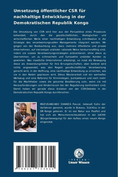 Die Umsetzung von CSR wird hier aus der Perspektive eines Prozesses behandelt, durch den die gesellschaftlichen, ökologischen und wirtschaftlichen Werte einer nachhaltigen Entwicklung schrittweise in die Strategie des verantwortungsvollen Managements integriert werden. Wir gingen von der Beobachtung aus, dass mehrere öffentliche und private Unternehmen, auf stereotype und/oder rationale Weise konkurrenzfähig sind, indem sie soziale Verantwortungsstrategien präsentieren, ohne diese zu übernehmen, um zu schmeicheln und Sympathie und/oder Kunden zu gewinnen. Was staatliche Unternehmen anbelangt, so nutzt die Bewegung diese als Anwendungsfelder für ihre Errungenschaften, aber konkret wird nichts angewendet, was den Regeln gesellschaftlicher Verantwortung gerecht wird, in der Hoffnung, eine nachhaltige Entwicklung zu erreichen, wie sie in den Reden gepriesen wird. Diese Masterarbeit soll ein wertvolles Werkzeug und eine Referenz für Kriminologen, Justizakteure und noch mehr für die Machthaber sowie die gesamte Bevölkerung sein, wenn sie mit Herausforderungen und Hindernissen bei der Regulierung konfrontiert sind; Damit haben wir gerade diese Isolation von der CSR-Debatte in der Demokratischen Republik Kongo durchbrochen.