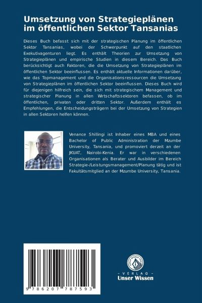 Dieses Buch befasst sich mit der strategischen Planung im öffentlichen Sektor Tansanias, wobei der Schwerpunkt auf den staatlichen Exekutivagenturen liegt. Es enthält Theorien zur Umsetzung von Strategieplänen und empirische Studien in diesem Bereich. Das Buch berücksichtigt auch Faktoren, die die Umsetzung von Strategieplänen im öffentlichen Sektor beeinflussen. Es enthält aktuelle Informationen darüber, wie das Topmanagement und die Organisationsressourcen die Umsetzung von Strategieplänen im öffentlichen Sektor beeinflussen. Dieses Buch wird für diejenigen hilfreich sein, die sich mit strategischem Management und strategischer Planung in allen Wirtschaftssektoren befassen, ob im öffentlichen, privaten oder dritten Sektor. Außerdem enthält es Empfehlungen, die Entscheidungsträgern bei der Umsetzung von Strategien in allen Sektoren helfen können.