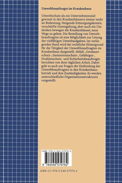 Umweltbeauftragte im Krankenhaus.- Die Betriebsbeauftragten für Umweltschutz: Rechte, Pflichten, Qualifizierung, Bestellung - eine Übersicht.- Verantwortung der Krankenhausleitung fir Umweltschutz - Organisation und Umsetzung.- Ökologie und Entsorgung im Universitätskrankenhaus Eppendorf, Hamburg.- Anforderungsprofil an die Betriebsbeauftragten fir Abfall.- Organisation und systembedingte Defizite der Abfallorganisation in einer Klinik der Maximalversorgung.- Straftaten, Ordnungswidrigkeiten und zivilrechtliche Haftung der Verantwortlichen.- Immissionsschutzbeauftragte - Erfahrungen mit einer Verbrennungsanlage für C-Abfall.- Erfahrungen des Gewässerschutzbeauftragten an einer Universitätsklinik.- Rechtliche Vorgaben zur Bestellung eines Gefahrgut- und Gefahrstoffbeauftragten - Anforderungen und Tätigkeitsprofil im Klinikbereich.- Der Strahlenschutzbeauftragte im Krankenhaus - Gesetzliche Grundlage, Tätigkeitsbereiche.- Möglichkeit der Umsetzung von Arbeitssicherheit und Umweltschutz in kleinen Krankenhäusern.- Umweltschutz im Universitätsklinikum Steglitz, Berlin.- Lösungen von Umweltaufgaben in Linienfunktion.