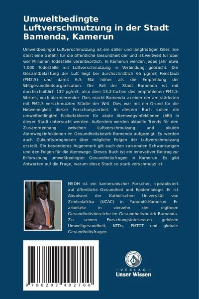 Umweltbedingte Luftverschmutzung ist ein stiller und langfristiger Killer. Sie stellt eine Gefahr für die öffentliche Gesundheit dar und ist weltweit für über vier Millionen Todesfälle verantwortlich. In Kamerun werden jedes Jahr etwa 7.000 Todesfälle mit Luftverschmutzung in Verbindung gebracht. Die Gesamtbelastung der Luft liegt bei durchschnittlich 65 mig/m3 Feinstaub (PM2,5) und damit 6,5 Mal höher als die Empfehlung der Weltgesundheitsorganisation. Der Fall der Stadt Bamenda ist mit durchschnittlich 132 mig/m3, also dem 13,2-fachen des empfohlenen PM2,5-Wertes, noch alarmierender. Dies macht Bamenda zu einer der am stärksten mit PM2,5 verschmutzten Städte der Welt. Dies war mit ein Grund für die Notwendigkeit dieser Forschungsarbeit. In diesem Buch sollen die umweltbedingten Risikofaktoren für akute Atemwegsinfektionen (ARI) in dieser Stadt untersucht werden. Außerdem werden aktuelle Trends für den Zusammenhang zwischen Luftverschmutzung und akuten Atemwegsinfektionen im Gesundheitsbezirk Bamenda aufgezeigt. Es werden auch Zukunftsprognosen über mögliche Folgen der Luftverschmutzung erstellt. Ein besonderes Augenmerk gilt auch den saisonalen Schwankungen und den Folgen für die Atemwege. Dieses Buch ist ein innovativer Beitrag zur Erforschung umweltbedingter Gesundheitsfragen in Kamerun. Es gibt Antworten auf die Frage, warum diese Stadt so stark verschmutzt ist.