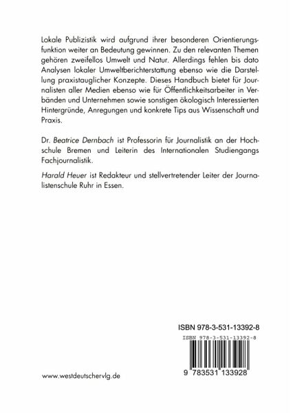 Umweltjournalismus im Lokalen Eine Einleitung.- I. Analyse, Recht und Sprache.- 1 Das Thema Umwelt in der lokalen Publizistik. Zur Vermittlung ökologischer Sachverhalte in Theorie und Praxis.- 2 Freier Zugang zu Informationen über die Umwelt.- 3 Über komplexe Sachverhalte schreiben Tipps für Stil und Sprache in der Umweltberichterstattung.- II. Recherche, Aktionen und Projekte.- 4 Umweltrecherche im Lokalen: Strategien und Quellen.- 5 Umweltrecherche im Internet.- 6 Die Redaktion als Ratgeber -Aktionen und Projekte des Hamburger Abendblatts.- 7 Wenn das Trinkwasser müffelt -Automatismen in der Umwelt-Pressearbeit.- 8 Lobbyarbeit für die Umwelt am Beispiel "Braunkohletagebau Garzweiler II" -Eine Region kommt in die Schlagzeilen.- III. Berufsfeld und Qualifizierung.- 9 Von Beruf Umweltjournalist: Spezialisten vor Ort sind rar.- 10 Konzept contra Zufall -Qualifizierte Umweltberichterstattung durch professionelle Fortbildung.- IV. Tipps und Adressen.- 11 Umweltrecht und Grundbegriffe -Ratgeber und Lexikon.- 12 Sammlung interessanter Internetadressen.- Autorenverzeichnis.