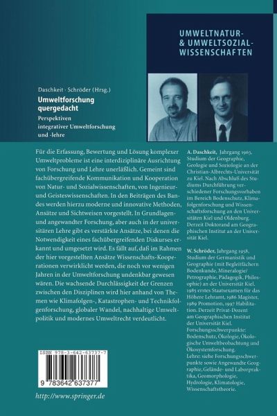 Einführung.- Umweltforschung zwischen Erkenntnis und Organisation.- Gestörte Natur - Anmerkungen zur integrativen Umweltforschung aus sozial-ökologischer Sicht.- Umweltforschung interdisziplinär - notwendig, aber unmöglich?.- Eine Wissenschaftstheorie der Interdisziplinarität. Zur Grundlegung integrativer Umweltforschung und -bewertung.- Natur als Konzept. Zur gesellschaftlichen Definition von Natur in der Moderne.- Nachhaltigkeit als Leitbild einer natur- und sozialwissenschaftlichen Umweltforschung.- Das Leitbild einer global zukunftsfähigen Entwicklung. Perspektiven seiner Operationalisierung am Beispiel der Klimaproblematik.- UVP in der Krise - Gedanken zur Erhaltung eines effektiven Umwelt-Vorsorge-Instruments aus der Sicht von Gutachtern.- Von Sonden und Satelliten - Gesellschaftliches Monitoring als Herausforderung der Umweltpsychologie.- Zur rechtlichen Überprüfung von Umweltbewertungen.- Unsicherheit und Ambivalenz: Welche Aussagekraft haben die Erkenntnisse der Technikfolgenabschätzung?.- Die globale Umwelt als Wille und Vorstellung. Zur transdisziplinären Erforschung des Globalen Wandels.- Umweltforschung zwischen Formalwissenschaft und Verständnis. Muß man den Formalismus beherrschen, um die Formalisten zu schlagen?.- Ökologie und Umweltrecht als Herausforderung natur- und sozialwissenschaftlicher Forschung und Lehre.- Der Klimawandel und seine Folgen: Problematisch für die Küsten, aber hilfreich für die Forschung?.- Umwelt und Ethik. Sinn und Unsinn bereichsspezifischer Ethiken für eine integrative Umweltbewertung.- Angewandte Ökosystemforschung - contradictio in adjecto?.