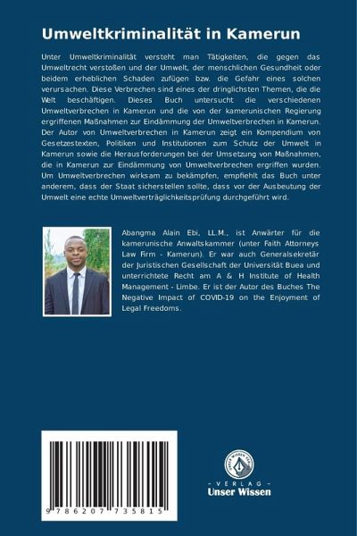 Unter Umweltkriminalität versteht man Tätigkeiten, die gegen das Umweltrecht verstoßen und der Umwelt, der menschlichen Gesundheit oder beidem erheblichen Schaden zufügen bzw. die Gefahr eines solchen verursachen. Diese Verbrechen sind eines der dringlichsten Themen, die die Welt beschäftigen. Dieses Buch untersucht die verschiedenen Umweltverbrechen in Kamerun und die von der kamerunischen Regierung ergriffenen Maßnahmen zur Eindämmung der Umweltverbrechen in Kamerun. Der Autor von Umweltverbrechen in Kamerun zeigt ein Kompendium von Gesetzestexten, Politiken und Institutionen zum Schutz der Umwelt in Kamerun sowie die Herausforderungen bei der Umsetzung von Maßnahmen, die in Kamerun zur Eindämmung von Umweltverbrechen ergriffen wurden. Um Umweltverbrechen wirksam zu bekämpfen, empfiehlt das Buch unter anderem, dass der Staat sicherstellen sollte, dass vor der Ausbeutung der Umwelt eine echte Umweltverträglichkeitsprüfung durchgeführt wird.