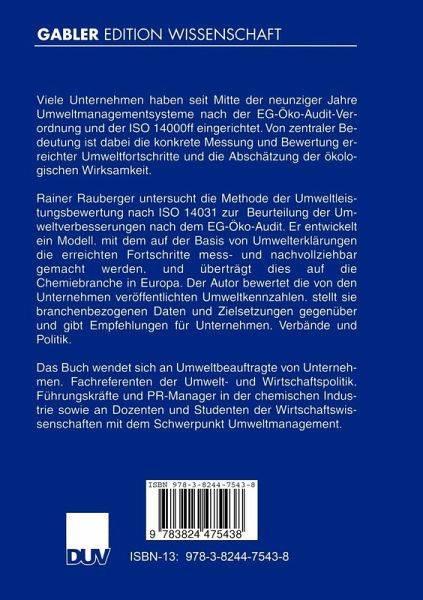 Rainer Rauberger untersucht die Methode der Umweltleistungsbewertung nach ISO 14031 zur Beurteilung der Umweltverbesserungen nach dem EG-Öko-Audit. Er entwickelt ein Modell, mit dem auf der Basis von Umwelterklärungen die erreichten Fortschritte mess- und nachvollziehbar gemacht werden und überträgt dies auf die Chemiebranche in Europa. Der Autor bewertet die von den Unternehmen veröffentlichten Umweltkennzahlen, stellt sie branchenbezogenen Daten und Zielsetzungen gegenüber und gibt Empfehlungen für Unternehmen, Verbände und Politik.