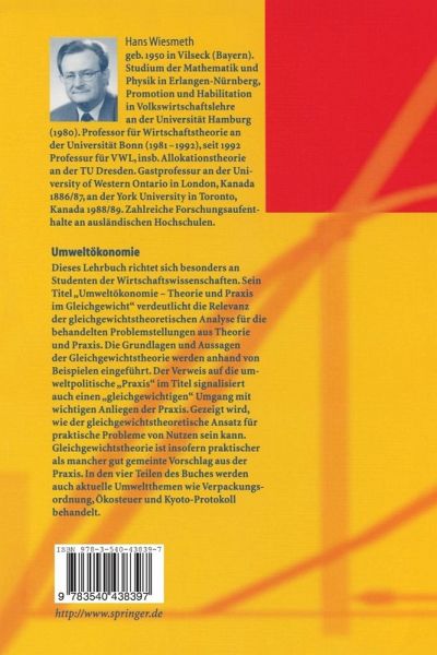 Dieses Lehrbuch richtet sich besonders an Studenten der Wirtschaftswissenschaften. Sein Titel Umweltökonomie. Theorie und Praxis im Gleichgewicht verdeutlicht die Relevanz der gleichgewichtstheoretischen Analyse für die behandelten Problemstellungen aus Theorie und Praxis. Die Grundlagen und Aussagen der Gleichgewichtstheorie werden anhand von Beispielen eingeführt. Der Verweis auf die umweltpolitische "Praxis" im Titel signalisiert auch einen "gleichgewichtigen" Umgang mit wichtigen Anliegen der Praxis. Gezeigt wird, wie der gleichgewichtstheoretische Ansatz für praktische Probleme von Nutzen sein kann. Gleichgewichtstheorie ist insofern praktischer als mancher gut gemeinte Vorschlag aus der Praxis. In den vier Teilen des Buches werden auch aktuelle Umweltthemen wie Verpackungsordnung, Ökosteuer und Kyoto-Protokoll behandelt.