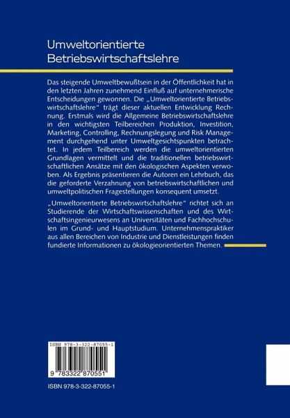 Das steigende Umweltbewußtsein in der Öffentlichkeit hat zunehmend Einfluß auf unternehmerische Entscheidungen gewonnen. Mit diesem Buch wird erstmals die Allgemeine Betriebswirtschaftslehre in den wichtigsten Teilbereichen Produktion, Investition, Marketing, Controlling, Rechnungslegung und Versicherung durchgehend unter Umweltgesichtspunkten betrachtet. In jedem dieser Teilbereiche werden die umweltorientierten Grundlagen vermittelt und die traditionellen betriebswirtschaftlichen Ansätze mit den ökologischen Aspekten verwoben. Als Ergebnis legen die Autoren ein Buch vor, das die geforderte Verzahnung von betriebswirtschaftlichen und umweltpolitischen Fragestellungen zum ersten Mal konsequent umsetzt.