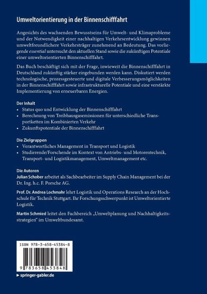 Angesichts des wachsenden Bewusstseins für Umwelt- und Klimaprobleme und der Notwendigkeit einer nachhaltigen Verkehrsentwicklung gewinnen umweltfreundlichere Verkehrsträger zunehmend an Bedeutung. Das vorliegende essential untersucht den aktuellen Stand sowie die zukünftigen Potentiale einer umweltorientierten Binnenschifffahrt.