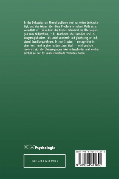 1 Einleitung.- 2 Psychologische Forschung zum Müllproblem.- 2.1 Forschungsentwicklung und Forschungstraditionen.- 2.2 Verhaltenstheoretisch orientierte Forschung.- 2.3 Kognitionstheoretisch und sozialpsychologisch orientierte Untersuchungen zum Recycling und Müllvermeideverhalten.- 2.4 Interventionsstudien auf Grundlage von sozialpsychologischen Modellen.- 3 Vom rationalen Handeln zum Einfluß sozialer Repräsentationen und des Diskurses.- 3.1 Modelle rationalen Handelns.- 3.2 Zum Ursprung von Überzeugungen und Wissen.- 3.3 Zusammenfassung und Fazit.- 4 Fragestellung und Konzeption der Untersuchung.- 4.1 Ableitung der Fragestellung.- 4.2 Erfassung der sozialen Repräsentationen und des Diskurses.- 4.3 Gesamtkonzeption der Untersuchung.- 4.4 Standardisierte Befragung zur Erfassung der sozialen Repräsentationen und ihres Zusammenhangs mit dem Verhalten.- 4.5 Rahmenbedingungen und Durchführung der Untersuchung.- 5 Umweltbewußtsein und Abfallwirtschaft in Ost und West.- 5.1 Umweltbewußtsein und Mülldiskurs.- 5.2 Abfallwirtschaft und Müllvermeideverhalten.- 5.3 Die Situation in Bochum und in Nordhausen.- 5.4 Erwartungen.- 6 Allgemeine Ergebnisse.- 6.1 FSRV: Soziodemographische Merkmale der Bochumer und der Nordhäuser Stichprobe.- 6.2 Fibelbefragung: Soziodemographische Merkmale der Bochumer und der Nordhäuser Stichprobe.- 6.3 Vergleich der unterschiedlichen Befragungsstichproben.- 7 Analyse der Sozialen Repräsentationen des Müllproblems: spezifische Problemsichten in Ost und West.- 7.1 Beschreibung der Antwortstrukturen mittels multidimensionaler Skalierung.- 7.2 Unterschiede in den Itempräferenzen.- 7.3 Zusammenfassung der Ergebnisse.- 8 Müllbewußtes Verhalten und der Zusammenhang mit der individuellen Problemsicht.- 8.1 Müllbewußtes Verhalten in Bochumund Nordhausen.- 8.2 Ergebnisse der Untersuchung des Zusammenhangs von Überzeugungen und Verhalten.- 9 Untersuchung der Akzeptanz spezifischer Müllfibeln.- 9.1 Psychologische Forschung zur Gestaltung von Information.- 9.2 Analyse der Broschürengespräche.- 9.3 Gestaltung der spezifischen Fibeln.- 9.4 Effekte der Fibeln: Ergebnisse.- 9.5 Diskussion der Ergebnisse.- 10 Diskussion der Untersuchung.- 10.1 Zur Stichprobe.- 10.2 Unterschiedliche soziale Repräsentationen des Müllproblems?.- 10.3 Zusammenhang von Überzeugungen und müllrelevantem Verhalten.- 10.4 Wirkung der Informationsbroschüren.- 10.5 Abschließende Bewertung der Untersuchung.- 10.6 Implikationen für die Forschung.- 10.7 Perspektiven für die Praxis.- Zusammenfassung.