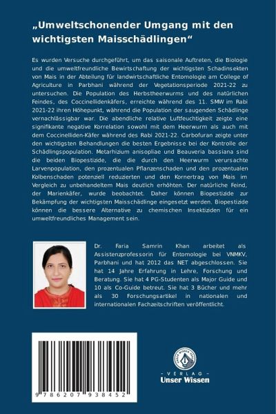 Es wurden Versuche durchgeführt, um das saisonale Auftreten, die Biologie und die umweltfreundliche Bewirtschaftung der wichtigsten Schadinsekten von Mais in der Abteilung für landwirtschaftliche Entomologie am College of Agriculture in Parbhani während der Vegetationsperiode 2021-22 zu untersuchen. Die Population des Herbstheerwurms und des natürlichen Feindes, des Coccinellidenkäfers, erreichte während des 11. SMW im Rabi 2021-22 ihren Höhepunkt, während die Population der saugenden Schädlinge vernachlässigbar war. Die abendliche relative Luftfeuchtigkeit zeigte eine signifikante negative Korrelation sowohl mit dem Heerwurm als auch mit dem Coccinelliden-Käfer während des Rabi 2021-22. Carbofuran zeigte unter den wichtigsten Behandlungen die besten Ergebnisse bei der Kontrolle der Schädlingspopulation. Metarhizium anisopliae und Beauveria bassiana sind die beiden Biopestizide, die die durch den Heerwurm verursachte Larvenpopulation, den prozentualen Pflanzenschaden und den prozentualen Kolbenschaden potenziell reduzierten und den Kornertrag von Mais im Vergleich zu unbehandeltem Mais deutlich erhöhten. Der natürliche Feind, der Marienkäfer, wurde beobachtet. Daher können Biopestizide zur Bekämpfung der wichtigsten Maisschädlinge eingesetzt werden. Biopestizide können die bessere Alternative zu chemischen Insektiziden für ein umweltfreundliches Management sein.
