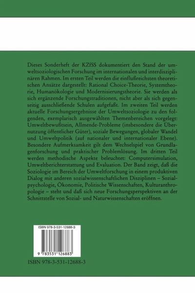 Um praktische Probleme im Umweltbereich zu lösen, ist es oft entscheidend, gesellschaftliche Aspekte angemessen zu berücksichtigen. Die umweltsoziologische Forschung verfügt über eine reiche Palette von Methoden und Kenntnissen, um diese Aufgabe zu bewältigen. Zugleich ist sie in der Lage, eine kritische Reflexion der heutigen Umweltproblematik zu ermöglichen und weiterzuentwickeln. Dieser Band gibt einen Überblick über den aktuellen Forschungsstand der Umweltsoziologie im internationalen Rahmen und unter Einschluß von Nachbardisziplinen. Besondere Aufmerksamkeit widmet er Ansätzen für zukünftige Forschungen, welche praktische und theoretische Anliegen verbinden. "(...) Der sehr umfangreichen Publikation ist eine breite Beachtung, weit über den Kreis der (Umwelt-)Soziologen hinaus zu wünschen, da sie gerade für interdisziplinär Interessierte eine sehr anregende Lektüre bietet." Politische Ökologie, Mai/Juni 1997 "(...) Zur Einarbeitung in den mittlerweile recht weit fortgeschrittenen Stand der soziologischen Thematisierung von Umweltfragen ist ein voluminöser und gut strukturierter Sammelband überaus empfehlenswert: Andreas Diekmann/Carlo C. Jaeger (Hrsg.), Umweltsoziologie. (...)" DGU-Nachrichten, April 1997 "(...) Der von Diekmann und Jäger herausgegebene Sammelband dokumentiert in eindrucksvoller Weise das inzwischen erreichte hohe professionelle Niveau der Arbeiten auf diesem neuen Feld. (...)" Soziologische Revue 3/98