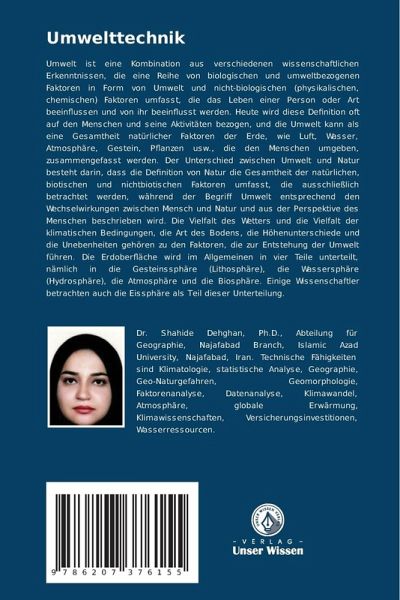 Umwelt ist eine Kombination aus verschiedenen wissenschaftlichen Erkenntnissen, die eine Reihe von biologischen und umweltbezogenen Faktoren in Form von Umwelt und nicht-biologischen (physikalischen, chemischen) Faktoren umfasst, die das Leben einer Person oder Art beeinflussen und von ihr beeinflusst werden. Heute wird diese Definition oft auf den Menschen und seine Aktivitäten bezogen, und die Umwelt kann als eine Gesamtheit natürlicher Faktoren der Erde, wie Luft, Wasser, Atmosphäre, Gestein, Pflanzen usw., die den Menschen umgeben, zusammengefasst werden. Der Unterschied zwischen Umwelt und Natur besteht darin, dass die Definition von Natur die Gesamtheit der natürlichen, biotischen und nichtbiotischen Faktoren umfasst, die ausschließlich betrachtet werden, während der Begriff Umwelt entsprechend den Wechselwirkungen zwischen Mensch und Natur und aus der Perspektive des Menschen beschrieben wird. Die Vielfalt des Wetters und die Vielfalt der klimatischen Bedingungen, die Art des Bodens, die Höhenunterschiede und die Unebenheiten gehören zu den Faktoren, die zur Entstehung der Umwelt führen. Die Erdoberfläche wird im Allgemeinen in vier Teile unterteilt, nämlich in die Gesteinssphäre (Lithosphäre), die Wassersphäre (Hydrosphäre), die Atmosphäre und die Biosphäre. Einige Wissenschaftler betrachten auch die Eissphäre als Teil dieser Unterteilung.