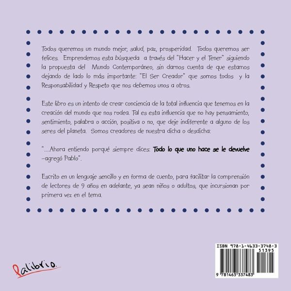 Todos queremos un mundo mejor, salud, paz, prosperidad. Todos queremos ser felices. Emprendemos esta búsqueda a través del "Hacer y el Tener" siguiendo la propuesta del Mundo Contemporáneo, sin darnos cuenta de que estamos dejando de lado lo más importante: "El Ser Creador" que somos todos y la Responsabilidad y Respeto que nos debemos unos a otros. Este libro es un intento de crear conciencia de la total influencia que tenemos en la creación del mundo que nos rodea. Es tal esta influencia que no hay pensamiento, sentimiento, palabra o acción, positiva o no, que deje indiferente a alguno de los seres del planeta. Somos creadores de nuestra dicha o desdicha: "....Ahora entiendo porqué siempre dices: Todo lo que uno hace se le devuelve -agregó Pablo". Escrito en un lenguaje sencillo y en forma de cuento, para facilitar la comprensión de lectores de 9 años en adelante, ya sean niños o adultos, que incursionan por primera vez en el tema.
