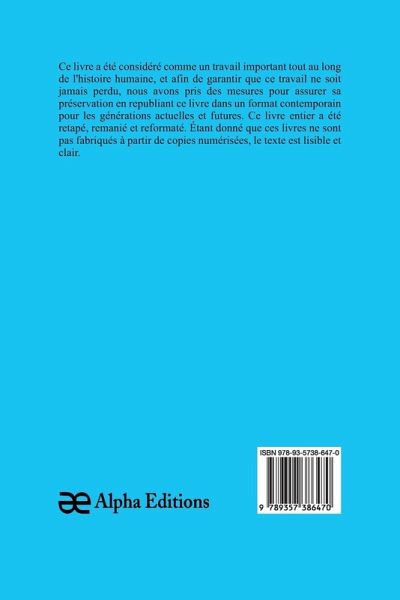 Un amant, a été considérée comme importante tout au long de l'histoire de l'humanité. Dans un effort pour s'assurer que ce travail ne soit jamais perdu, nous avons pris des mesures pour assurer sa préservation en republiant ce livre dans un format moderne pour les générations actuelles et futures. Ce livre complet a été retapé, remanié et reformaté. Comme ces livres ne sont pas des scans des publications originales des auteurs, le texte est lisible et clair.