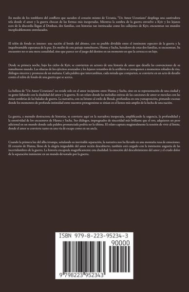 En medio de los temblores del conflicto que sacuden el corazón mismo de Ucrania, "Un Amor Ucraniano" despliega una cautivadora tela donde el amor y la guerra chocan de las formas más inesperadas. Mientras la sombra de la guerra envuelve a Kyiv y los lejanos ecos de la discordia llegan al Donbass, dos familias, con historias tan intrincadas como los callejones de Kyiv, encuentran sus mundos inexplicablemente entrelazados. El telón de fondo es intenso: una nación al borde del abismo, con su pueblo dividido entre el inminente espectro de la guerra y la inquebrantable esperanza de la paz. En medio de este paisaje tumultuoso, Hanna y Sacha, herederos de estas dos familias, se encuentran. Su encuentro no es una mera casualidad, sino que parece ser el juego del destino en un momento en que la certeza es un lujo. Desde su primera noche, bajo los cielos de Kyiv, se convierten en actores de una historia de amor que desafía las convenciones de su tumultuoso mundo. Las siluetas de los ejércitos avanzados y los lejanos retumbos de la artillería se yuxtaponen a momentos robados de risa, diálogos sinceros y promesas de un mañana. Cada palabra que intercambian, cada mirada que comparten, se convierte en un acto de desafío contra el telón de fondo de una guerra que se acerca. La belleza de "Un Amor Ucraniano". no reside solo en el amor incipiente entre Hanna y Sacha, sino en su representación de una ciudad y su gente lidiando con la dualidad del amor y la guerra. Es un relato donde las melodías etéreas de las canciones de amor se mezclan con las notas sombrías de las baladas de guerra. La narrativa, con su lirismo al estilo de Benak, profundiza en esta yuxtaposición, pintando escenas donde los momentos de profunda intimidad entre nuestros protagonistas se sitúan en el lienzo más amplio de la lucha de una nación. La guerra, a menudo destructora de historias, se convierte aquí en la narradora inesperada, amplificando la urgencia, la profundidad y la emotividad de los encuentros de Hanna y Sacha. Sus diálogos, impregnados de sinceridad más brillante que el oro, adquieren un peso adicional en un mundo donde cada palabra pronunciada podría ser la última. El relato captura magistralmente la tensión de vivir al límite, donde el amor se convierte tanto en una vía de escape como en un ancla. Cuando la primera luz del alba irrumpe, señalando su inevitable separación, la narrativa nos ha llevado en una montaña rusa de emociones. El corazón de Hanna, lleno de la alegría inigualable del amor recién descubierto, también está cargado con la inminente angustia de las incertidumbres de la guerra. La historia encapsula magníficamente esta dualidad: la emoción del descubrimiento del amor y el crudo dolor de la separación inminente en un mundo devastado por la guerra.