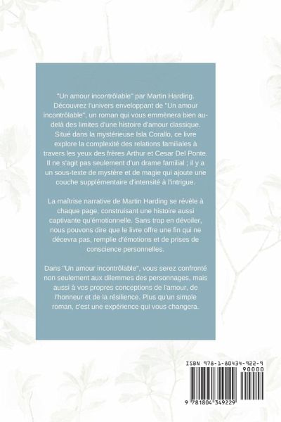 "Un amour incontrôlable" de Martin Harding. Découvrez l'univers enveloppant d'"Un amour incontrôlable", un roman qui vous emmènera bien au-delà des limites d'une histoire d'amour classique. Situé sur la mystérieuse Isla Corallo, ce livre explore la complexité des relations familiales à travers les yeux des frères Arthur et Cesar Del Ponte. Il ne s'agit pas seulement d'un drame familial ; il y a un sous-texte de mystère et de magie qui ajoute une couche supplémentaire d'intensité à l'intrigue. La maîtrise narrative de Martin Harding se révèle à chaque page, construisant une histoire aussi captivante qu'émotionnelle. Sans en révéler trop, nous pouvons dire que le livre offre une fin qui ne décevra pas, remplie d'émotions et de prises de conscience personnelles. Dans "Un amour incontrôlable", vous serez confronté non seulement aux dilemmes des personnages, mais aussi à vos propres conceptions de l'amour, de l'honneur et de la résilience. Plus qu'un simple roman, c'est une expérience qui vous changera.