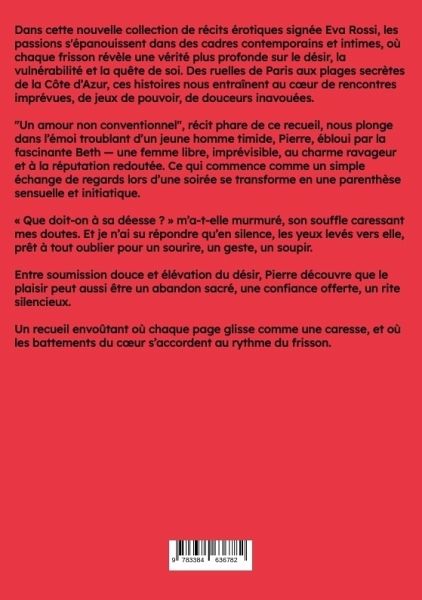 Dans cette nouvelle collection de récits érotiques signée Eva Rossi, les passions s'épanouissent dans des cadres contemporains et intimes, où chaque frisson révèle une vérité plus profonde sur le désir, la vulnérabilité et la quête de soi. Des ruelles de Paris aux plages secrètes de la Côte d'Azur, ces histoires nous entraînent au coeur de rencontres imprévues, de jeux de pouvoir, de douceurs inavouées."Un amour non conventionnel", récit phare de ce recueil, nous plonge dans l'émoi troublant d'un jeune homme timide, Pierre, ébloui par la fascinante Beth - une femme libre, imprévisible, au charme ravageur et à la réputation redoutée. Ce qui commence comme un simple échange de regards lors d'une soirée se transforme en une parenthèse sensuelle et initiatique.« Que doit-on à sa déesse ? » m'a-t-elle murmuré, son souffle caressant mes doutes. Et je n'ai su répondre qu'en silence, les yeux levés vers elle, prêt à tout oublier pour un sourire, un geste, un soupir.Entre soumission douceet élévation du désir, Pierre découvre que le plaisir peut aussi être un abandon sacré, une confiance offerte, un rite silencieux.Un recueil envoûtant où chaque page glisse comme une caresse, et où les battements du coeur s'accordent au rythme du frisson.
