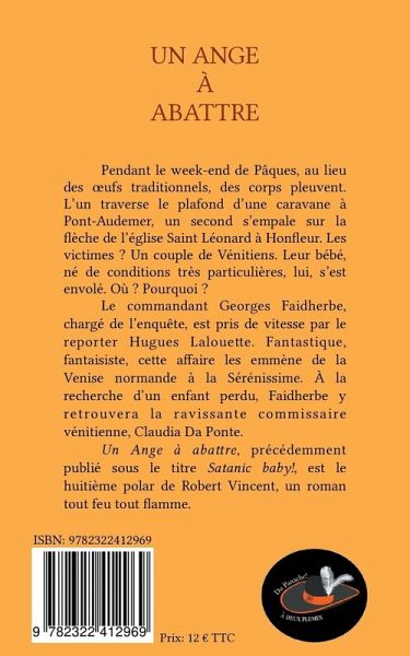DIMANCHE DE PÂQUES. PENDANT QUE SONNENT LES CLOCHES, DEUX CORPS TOMBENT DU CIEL ET UN BÉBÉ HORS DU COMMUN DISPARAÎT ENTRE PONT-AUDEMER ET HONFLEUR, NORMANDIE.LE COMMANDANT GEORGES FAIDHERBE, HÉROS RÉCURRENT DES POLARS DE ROBERT VINCENT, ENQUÊTE EN COMPAGNIE DE LA RAVISSANTE COMMISSAIRE ITALIENNE CLAUDIA DA PONTE.CE HUITIÈME ROMAN D'HUMOUR NOIR, PRÉCÉDEMMENT PUBLIÉ SOUS LE TITRE DE "SATANIC BABY!", IMPRÉGNÉ DE FANTASTIQUE, DÉBORDANT DE FANTAISIE, VOUS EMMÈNERA JUSQU'À VENISE, ITALIE, À LA POURSUITE D'UN ENFANT TRÈS SINGULIER.