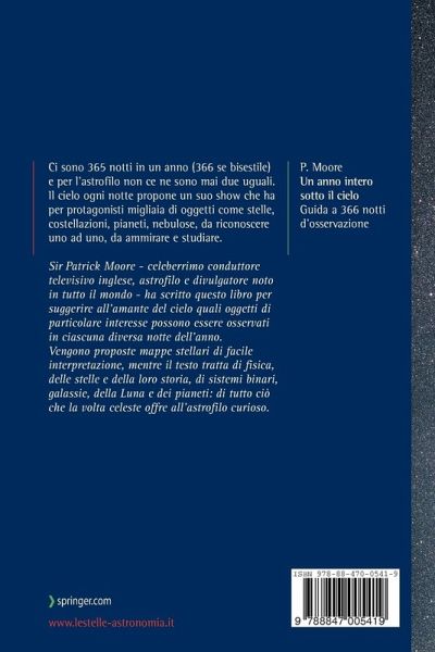 Sir Patrick Moore celeberrimo conduttore televisivo inglese, astrofilo e divulgatore noto in tutto il mondo ha scritto questo libro per suggerire all amante del cielo quali oggetti di particolare interesse possono essere osservati in ciascuna diversa notte dell anno. Vengono proposte mappe stellari di facile interpretazione, mentre il testo tratta di fisica, delle stelle e della loro storia, di sistemi binari, galassie, della Luna e dei pianeti: di tutto ciò che la volta celeste offre all astrofilo curioso.