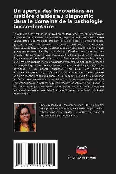 La pathologie est l'étude de la souffrance. Plus précisément, la pathologie buccale et maxillo-faciale s'intéresse au diagnostic et à l'étude des causes et des effets des maladies affectant la région buccale et maxillo-faciale, qu'elles soient congénitales, acquises, vasculaires, infectieuses, traumatiques, auto-immunes, métaboliques ou néoplasiques, pour n'en citer que quelques-unes. Le diagnostic de ces affections est important pour améliorer le pronostic. Il peut être réalisé à l'aide de diverses aides au diagnostic ou de tests effectués pour confirmer ou déterminer la présence d'une maladie chez un individu soupçonné d'en être atteint, généralement à la suite de l'apparition de symptômes.Le domaine de la pathologie s'est développé à un rythme exponentiel au cours des dernières décennies.L'histopathologie a été pendant de nombreuses années l'étalon-or du diagnostic des lésions buccales ; cependant, il s'agit d'un processus plutôt lent.Les techniques moléculaires ont grandement contribué à la compréhension de la pathogenèse des troubles génétiques et au diagnostic de plusieurs néoplasmes malins indifférenciés. Ce livre traite de diverses techniques avancées qui aident à diagnostiquer différentes conditions pathologiques.