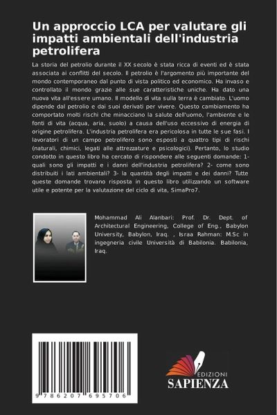 La storia del petrolio durante il XX secolo è stata ricca di eventi ed è stata associata ai conflitti del secolo. Il petrolio è l'argomento più importante del mondo contemporaneo dal punto di vista politico ed economico. Ha invaso e controllato il mondo grazie alle sue caratteristiche uniche. Ha dato una nuova vita all'essere umano. Il modello di vita sulla terra è cambiato. L'uomo dipende dal petrolio e dai suoi derivati per vivere. Questo cambiamento ha comportato molti rischi che minacciano la salute dell'uomo, l'ambiente e le fonti di vita (acqua, aria, suolo) a causa dell'uso eccessivo di energia di origine petrolifera. L'industria petrolifera era pericolosa in tutte le sue fasi. I lavoratori di un campo petrolifero sono esposti a quattro tipi di rischi (naturali, chimici, legati alle attrezzature e psicologici). Pertanto, lo studio condotto in questo libro ha cercato di rispondere alle seguenti domande: 1- quali sono gli impatti e i danni dell'industria petrolifera? 2- come sono distribuiti i lati ambientali? 3- la quantità degli impatti e dei danni? Tutte queste domande trovano risposta in questo libro utilizzando un software utile e potente per la valutazione del ciclo di vita, SimaPro7.