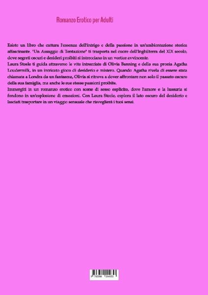 Esiste un libro che cattura l'essenza dell'intrigo e della passione in un'ambientazione storica affascinante. "Un Assaggio di Tentazione" ti trasporta nel cuore dell'Inghilterra del XIX secolo, dove segreti oscuri e desideri proibiti si intrecciano in un vortice avvincente.Laura Steele ti guida attraverso le vite intrecciate di Olivia Banning e della sua prozia Agatha Loudermilk, in un intricato gioco di desiderio e mistero. Quando Agatha rivela di essere stata chiamata a Londra da un fantasma, Olivia si ritrova a dover affrontare non solo il passato oscuro della sua famiglia, ma anche le sue stesse passioni proibite.Immergiti in un romanzo erotico con scene di sesso esplicito, dove l'amore e la lussuria si fondono in un'esplosione di emozioni. Con Laura Steele, esplora il lato oscuro del desiderio e lasciati trasportare in un viaggio sensuale che risveglierà i tuoi sensi.