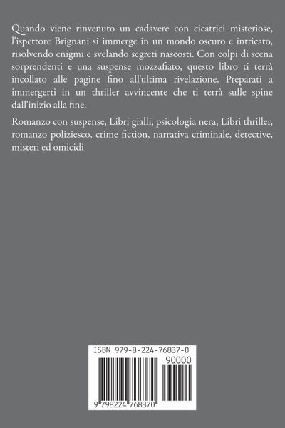 Un'indagine avvincente ti attende nelle pagine di questo coinvolgente romanzo crime fiction. Segui l'ispettore Brignani mentre affronta un caso che mette alla prova le sue abilità investigative e il suo coraggio. Quando viene rinvenuto un cadavere con cicatrici misteriose, Brignani si immerge in un mondo oscuro e intricato, risolvendo enigmi e svelando segreti nascosti. Con colpi di scena sorprendenti e una suspense mozzafiato, questo libro ti terrà incollato alle pagine fino all'ultima rivelazione. Preparati a immergerti in un thriller avvincente che ti terrà sulle spine dall'inizio alla fine. Romanzo con suspense, Libri gialli, psicologia nera, Libri thriller, romanzo poliziesco, crime fiction, narrativa criminale, detective, misteri ed omicidi