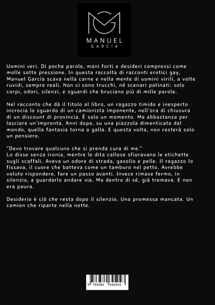 Uomini veri. Di poche parole, mani forti e desideri compressi come molle sotto pressione. In questa raccolta di racconti erotici gay, Manuel García scava nella carne e nella mente di uomini virili, a volte ruvidi, sempre reali. Non ci sono trucchi, né scenari patinati: solo corpi, odori, silenzi, e sguardi che bruciano più di mille parole.Nel racconto che dà il titolo al libro, un ragazzo timido e inesperto incrocia lo sguardo di un camionista imponente, nell'ora di chiusura di un discount di provincia. È solo un momento. Ma abbastanza per lasciare un'impronta. Anni dopo, su una piazzola dimenticata dal mondo, quella fantasia torna a galla. E questa volta, non resterà solo un pensiero."Devo trovare qualcuno che si prenda cura di me."Lo disse senza ironia, mentre le dita callose sfioravano le etichette sugli scaffali. Aveva un odore di strada, gasolio e pelle. Il ragazzo lo fissava, il cuore che batteva come un tamburo nel petto. Avrebbe voluto rispondere, fare un passo avanti. Invece rimase fermo, in silenzio, a guardarlo andare via. Ma dentro di sé, già tremava. E non era paura.Desiderio è ciò che resta dopo il silenzio. Una promessa mancata. Un camion che riparte nella notte.