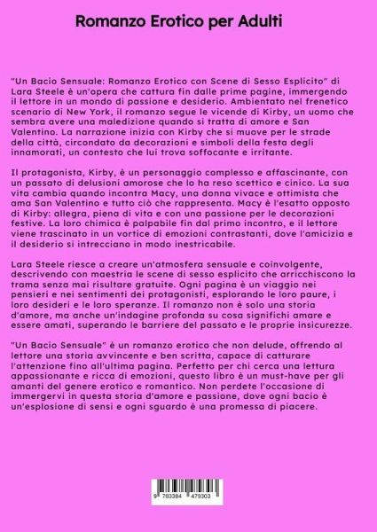 "Un Bacio Sensuale: Romanzo Erotico con Scene di Sesso Esplicito" di Lara Steele è un'opera che cattura fin dalle prime pagine, immergendo il lettore in un mondo di passione e desiderio. Ambientato nel frenetico scenario di New York, il romanzo segue le vicende di Kirby, un uomo che sembra avere una maledizione quando si tratta di amore e San Valentino. La narrazione inizia con Kirby che si muove per le strade della città, circondato da decorazioni e simboli della festa degli innamorati, un contesto che lui trova soffocante e irritante.Il protagonista, Kirby, è un personaggio complesso e affascinante, con un passato di delusioni amorose che lo ha reso scettico e cinico. La sua vita cambia quando incontra Macy, una donna vivace e ottimista che ama San Valentino e tutto ciò che rappresenta. Macy è l'esatto opposto di Kirby: allegra, piena di vita e con una passione per le decorazioni festive. La loro chimica è palpabile fin dal primo incontro, e il lettore viene trascinato in un vortice di emozioni contrastanti, dove l'amicizia e il desiderio si intrecciano in modo inestricabile.Lara Steele riesce a creare un'atmosfera sensuale e coinvolgente, descrivendo con maestria le scene di sesso esplicito che arricchiscono la trama senza mai risultare gratuite. Ogni pagina è un viaggio nei pensieri e nei sentimenti dei protagonisti, esplorando le loro paure, i loro desideri e le loro speranze. Il romanzo non è solo una storia d'amore, ma anche un'indagine profonda su cosa significhi amare e essere amati, superando le barriere del passato e le proprie insicurezze."Un Bacio Sensuale" è un romanzo erotico che non delude, offrendo al lettore una storia avvincente e ben scritta, capace di catturare l'attenzione fino all'ultima pagina. Perfetto per chi cerca una lettura appassionante e ricca di emozioni, questo libro è un must-have per gli amanti del genere erotico e romantico. Non perdete l'occasione di immergervi in questa storia d'amore e passione, dove ogni bacio è un'esplosione di sensi e ogni sguardo è una promessa di piacere.