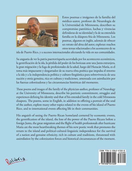 Estos poemas e imágenes de la familia del médico-autor, profesor de Neurología de la Universidad de Minnesota, describen su compromiso patriótico, luchas y vivencias definidoras de su identidad y la de su extendida familia en la diáspora fría de Minnesota. Los poemas, algunos en inglés, además de ofrecer un retrato del alma del autor, exploran muchos otros temas relacionados a los aconteceres de su isla de Puerto Rico, y a sucesos internacionales afectando la vida en sus comunidades. Su angustia de ver la patria puertorriqueña acorralada por los aconteceres económicos, la gentrificación de la isla, la pérdida del poder de los boricuas ante una Junta extranjera, la gran migración y la fuga de profesionales de la salud, luego del Huracán María, es el tema más impactante y desgarrador de su nueva obra poética que impulsa el retorno a la isla y a la independencia política y culturo-lingüística para sobrevivencia de una nación y etnia genuina, rica en cultura y tradiciones, amenzada con asimilación por las fuerzas colonizadoras y las circunstancias históricas del momento. These poems and images of the family of the physician-author, professor of Neurology at the University of Minnesota, describe his patriotic commitment, struggles and experiences defining his identity and that of his extended family in the cold Minnesota diaspora. The poems, some in English, in addition to offering a portrait of the soul of the author, explore many other topics related to the events of his island of Puerto Rico, and to international events affecting life in their communities. His anguish of seeing the Puerto Rican homeland cornered by economic events, the gentrification of the island, the loss of the power of the Puerto Ricans before a foreign Junta, the great migration and the flight of health professionals after hurricane Maria are the most heartbreaking themes of his new poetic work that promotes the return to the island and political-cultural-linguistic independence for the survival of a nation and genuine ethnicity, rich in culture and traditions, threatened with assimilation by the colonization forces and historical circumstances of the moment.