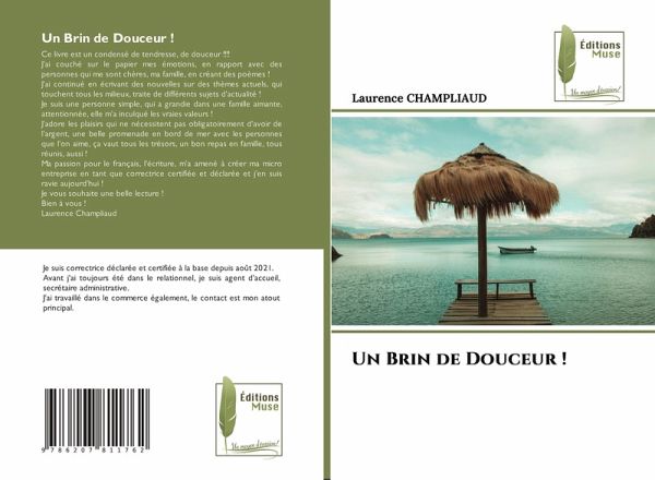 Ce livre est un condensé de tendresse, de douceur !!!!J'ai couché sur le papier mes émotions, en rapport avec des personnes qui me sont chères, ma famille, en créant des poèmes !J'ai continué en écrivant des nouvelles sur des thèmes actuels, qui touchent tous les milieux, traite de différents sujets d'actualité !Je suis une personne simple, qui a grandie dans une famille aimante, attentionnée, elle m'a inculqué les vraies valeurs !J'adore les plaisirs qui ne nécessitent pas obligatoirement d'avoir de l'argent, une belle promenade en bord de mer avec les personnes que l'on aime, ça vaut tous les trésors, un bon repas en famille, tous réunis, aussi !Ma passion pour le français, l'écriture, m'a amené à créer ma micro entreprise en tant que correctrice certifiée et déclarée et j'en suis ravie aujourd'hui !Je vous souhaite une belle lecture !Bien à vous !Laurence Champliaud