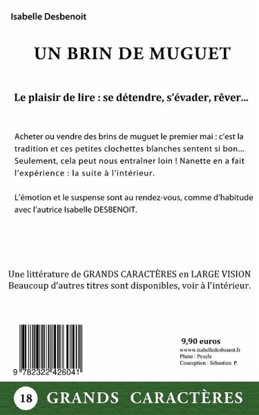 Isabelle DESBENOIT est une romancière de GRANDS CARACTÈRES ! Cette autrice a des milliers de lectrices et de lecteurs qui lisent ses ouvrages sur différents supports (livres légers, e-books ou magazines...) Des intrigues vivantes et divertissantes (sans scènes de violence ou de vulgarité). L'émotion et le suspense sont bien là ! Les retraitées et retraités l'adorent car elle les met à l'honneur : la série "BERTILLE" et celle de "La Villa aux Oiseaux" leur laissent notamment une place de choix avec leurs enfants et leurs petits-enfants. Pour ces derniers, les romans Aventures /Amitiés des "FARID" sont très appréciés (9-14 ans) . Quelque soit votre âge, si vous êtes fan de développement personnel et de lecture, n'hésitez-pas ! Ces petits romans vous combleront ! Vous trouverez les livres d'Isabelle DESBENOIT partout : en Librairie ou sur Internet mais aussi dans les médiathèques au rayon LARGE VISION.