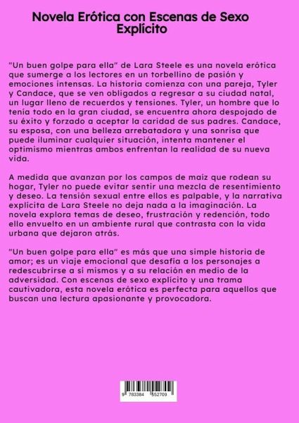 "Un buen golpe para ella" de Lara Steele es una novela erótica que sumerge a los lectores en un torbellino de pasión y emociones intensas. La historia comienza con una pareja, Tyler y Candace, que se ven obligados a regresar a su ciudad natal, un lugar lleno de recuerdos y tensiones. Tyler, un hombre que lo tenía todo en la gran ciudad, se encuentra ahora despojado de su éxito y forzado a aceptar la caridad de sus padres. Candace, su esposa, con una belleza arrebatadora y una sonrisa que puede iluminar cualquier situación, intenta mantener el optimismo mientras ambos enfrentan la realidad de su nueva vida.A medida que avanzan por los campos de maíz que rodean su hogar, Tyler no puede evitar sentir una mezcla de resentimiento y deseo. La tensión sexual entre ellos es palpable, y la narrativa explícita de Lara Steele no deja nada a la imaginación. La novela explora temas de deseo, frustración y redención, todo ello envuelto en un ambiente rural que contrasta con la vida urbana que dejaron atrás."Un buen golpe para ella" es más que una simple historia de amor; es un viaje emocional que desafía a los personajes a redescubrirse a sí mismos y a su relación en medio de la adversidad. Con escenas de sexo explícito y una trama cautivadora, esta novela erótica es perfecta para aquellos que buscan una lectura apasionante y provocadora.