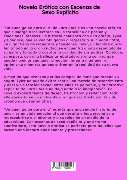 "Un buen golpe para ella" de Lara Steele es una novela erótica que sumerge a los lectores en un torbellino de pasión y emociones intensas. La historia comienza con una pareja, Tyler y Candace, que se ven obligados a regresar a su ciudad natal, un lugar lleno de recuerdos y tensiones. Tyler, un hombre que lo tenía todo en la gran ciudad, se encuentra ahora despojado de su éxito y forzado a aceptar la caridad de sus padres. Candace, su esposa, con una belleza arrebatadora y una sonrisa que puede iluminar cualquier situación, intenta mantener el optimismo mientras ambos enfrentan la realidad de su nueva vida.A medida que avanzan por los campos de maíz que rodean su hogar, Tyler no puede evitar sentir una mezcla de resentimiento y deseo. La tensión sexual entre ellos es palpable, y la narrativa explícita de Lara Steele no deja nada a la imaginación. La novela explora temas de deseo, frustración y redención, todo ello envuelto en un ambiente rural que contrasta con la vida urbana que dejaron atrás."Un buen golpe para ella" es más que una simple historia de amor; es un viaje emocional que desafía a los personajes a redescubrirse a sí mismos y a su relación en medio de la adversidad. Con escenas de sexo explícito y una trama cautivadora, esta novela erótica es perfecta para aquellos que buscan una lectura apasionante y provocadora.