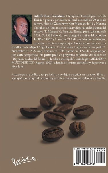 Escribir es un gusto, placer y privilegio del corazón, donde se encantan el pensamiento y la vida haciendo una fi esta pues tomar la pluma representa plasmar en papel y tinta el recuerdo aquel de lo que estamos hechos. Este libro es la primera manifestación de lo que mi pluma escribe y lo vuelca en 25 poemas distintos... escritos con la misma emoción de antaño. Poemas de amor, de mi amor a ella, a la mujer más hermosa de mi vida; cartas llenas de emoción, refl exión y de nostalgia; de la vida diaria, de mis hermanos y mis padres... y de los más recónditos lugares de mi alma y corazón forman este compendio de recuerdos, vida y tiempos idos. El libro que en tus manos tienes es simplemente un vasto recorrido de mi incesante andar por la vida y en honor a la verdad, es lo más hermoso que tengo: mis recuerdos, mis amores y el placer inmenso de escribir. Aquí estoy, primer lector de los poemas míos, entregándote mi vida, mi alma y corazón... siendo tú uno más de mis amigos para compartir contigo... Un café con la tinta de mi pluma... Adolfo Kott Gramlich
